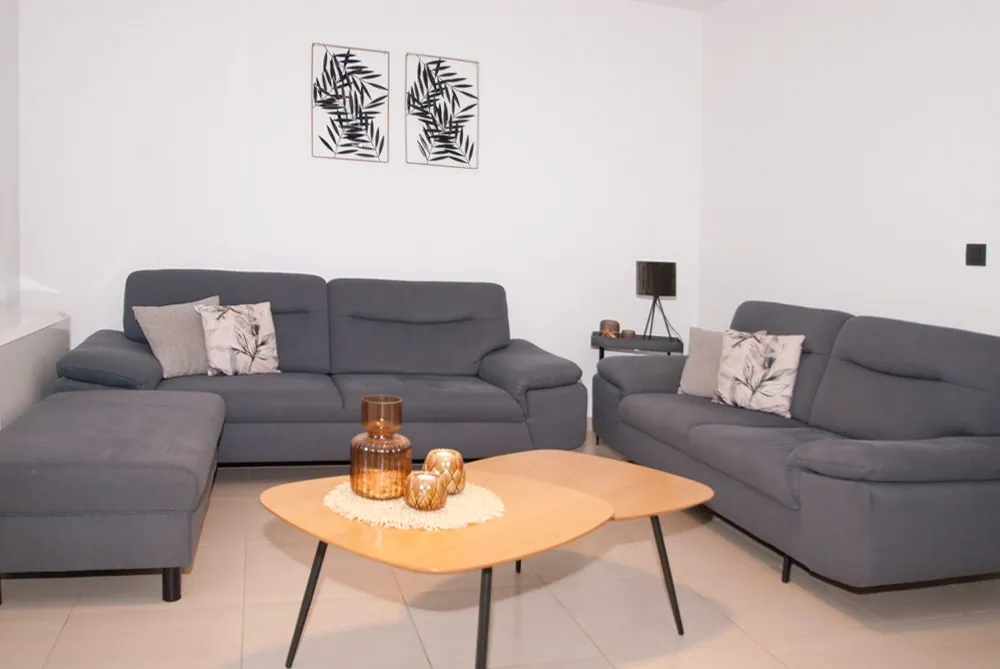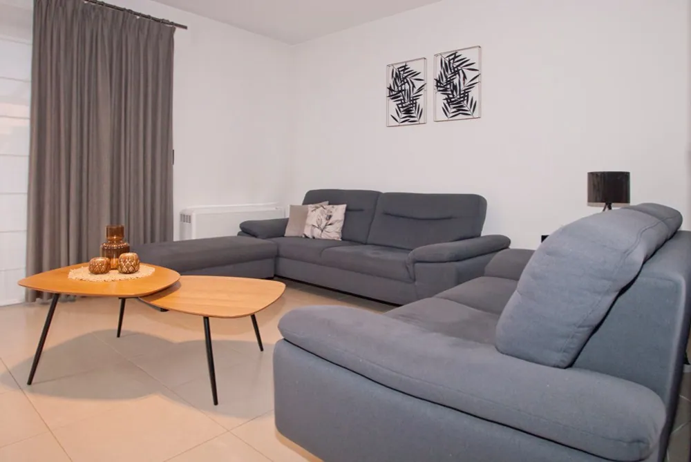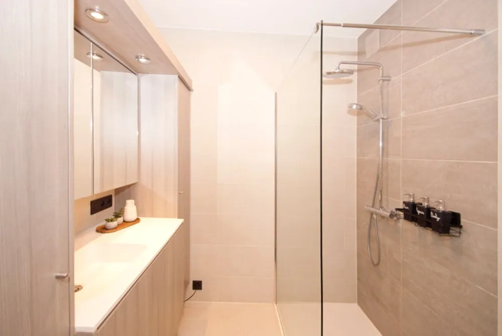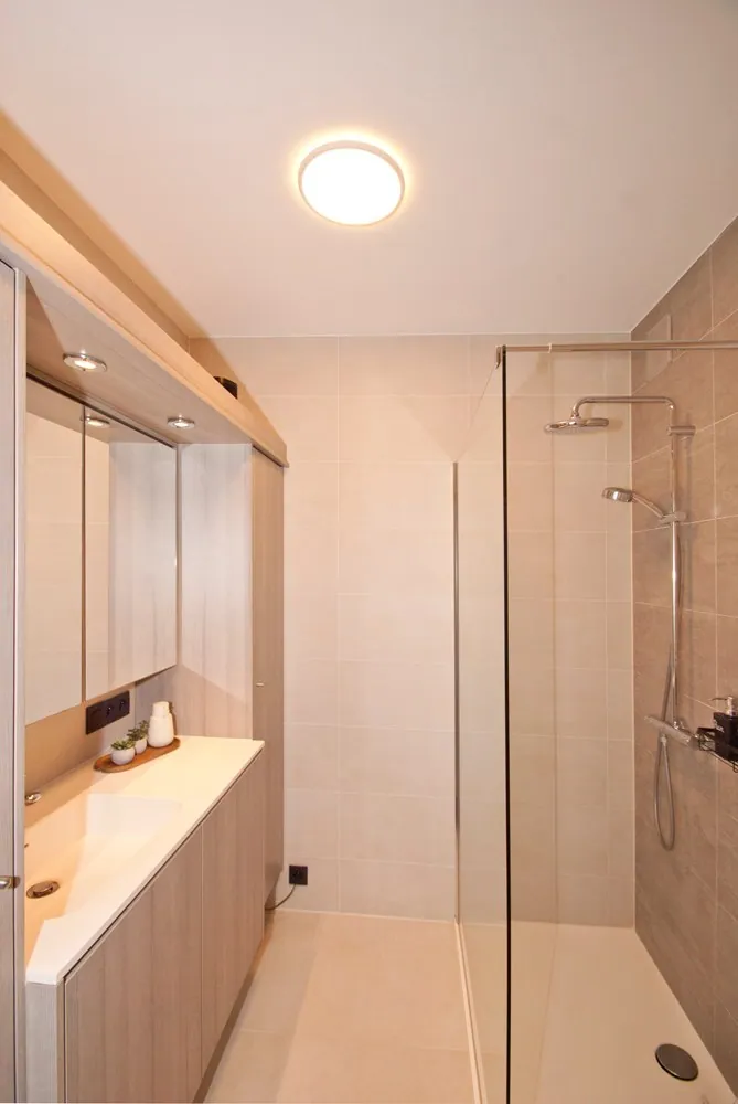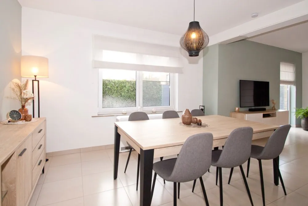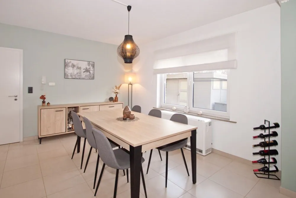 Indeling: gastentoilet; 2 slaapkamers; badkamer met lavabo en inloopdouche; hobbykamer; lichtrijke woonkamer (zit- en eetplaats) met volledig geïnstalleerde leefkeuken en ontbijtplaats, berging/wasplaats; ruim achterliggend terras (deels overkoepeld en volledig omheind) met directe toegang tot de autostaanplaats en fietsenberging.