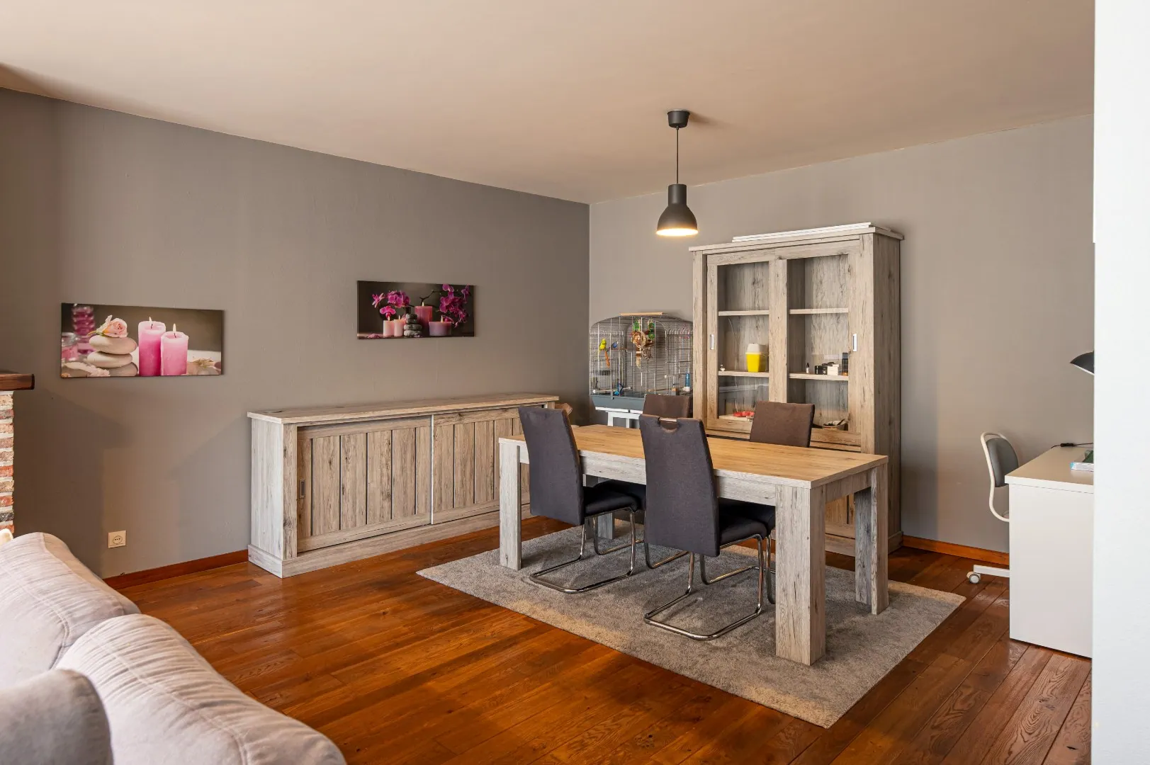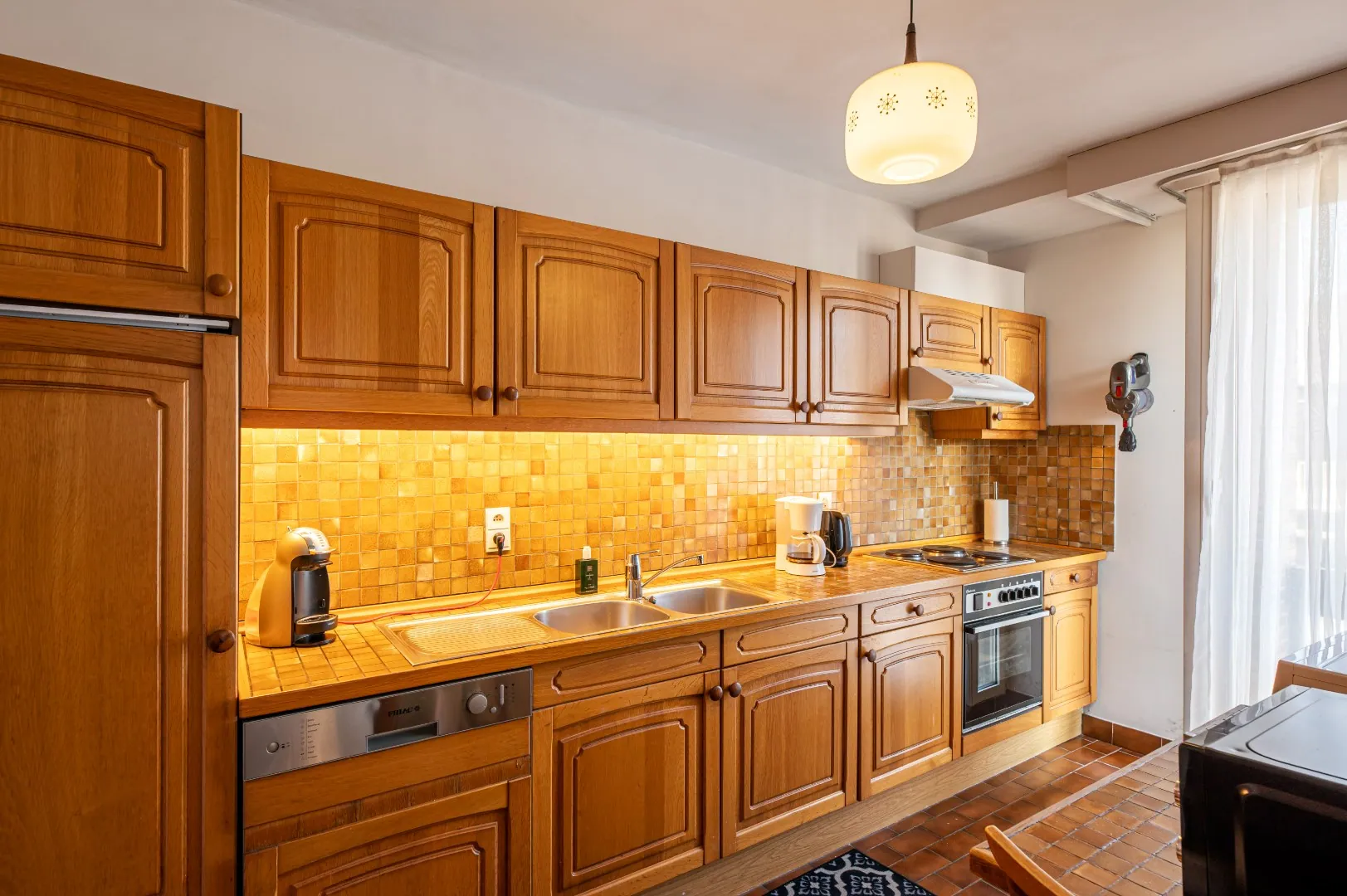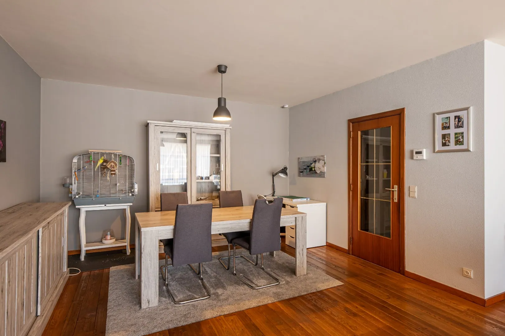 U komt binnen via de inkomhal met apart toilet. De ruime en lichtrijke woonkamer ligt op massief parket (38m²). Aangrenzend vindt u de geïnstalleerde keuken met vaatwasser, koelkast, oven, fornuis, dampkap.