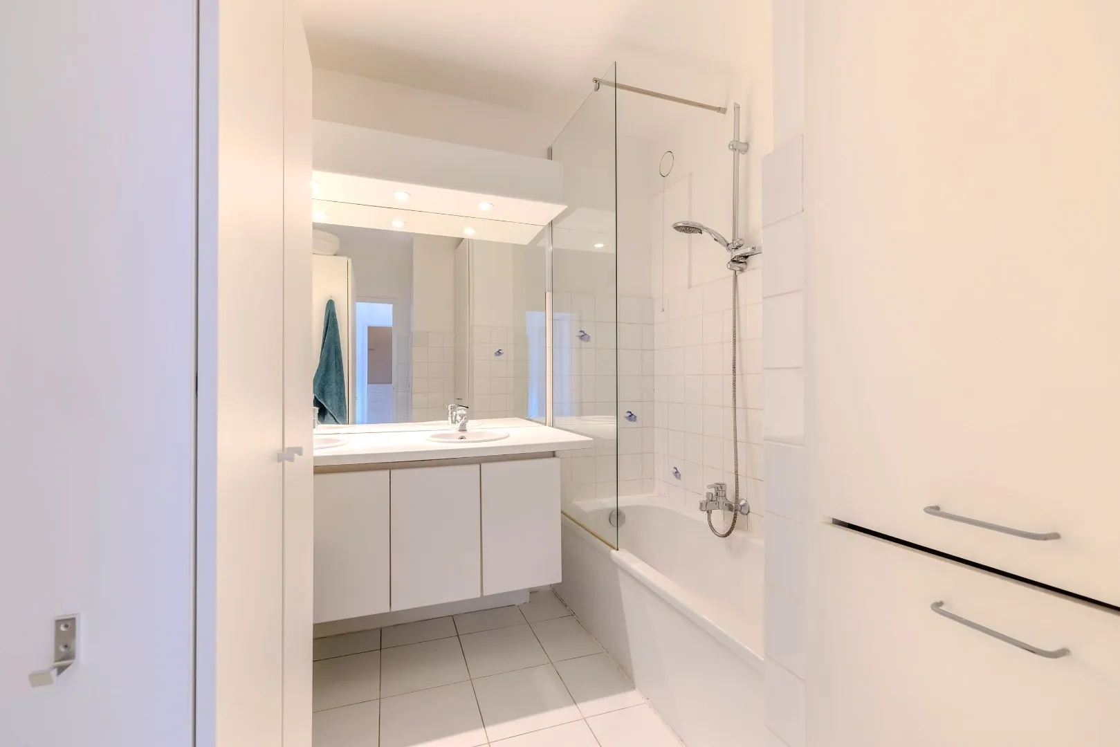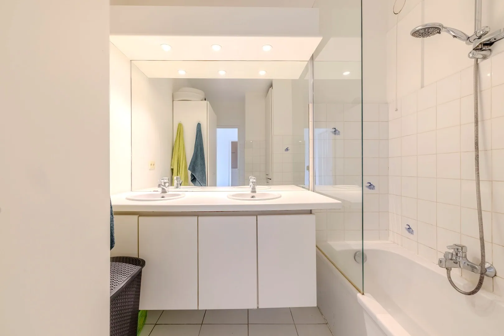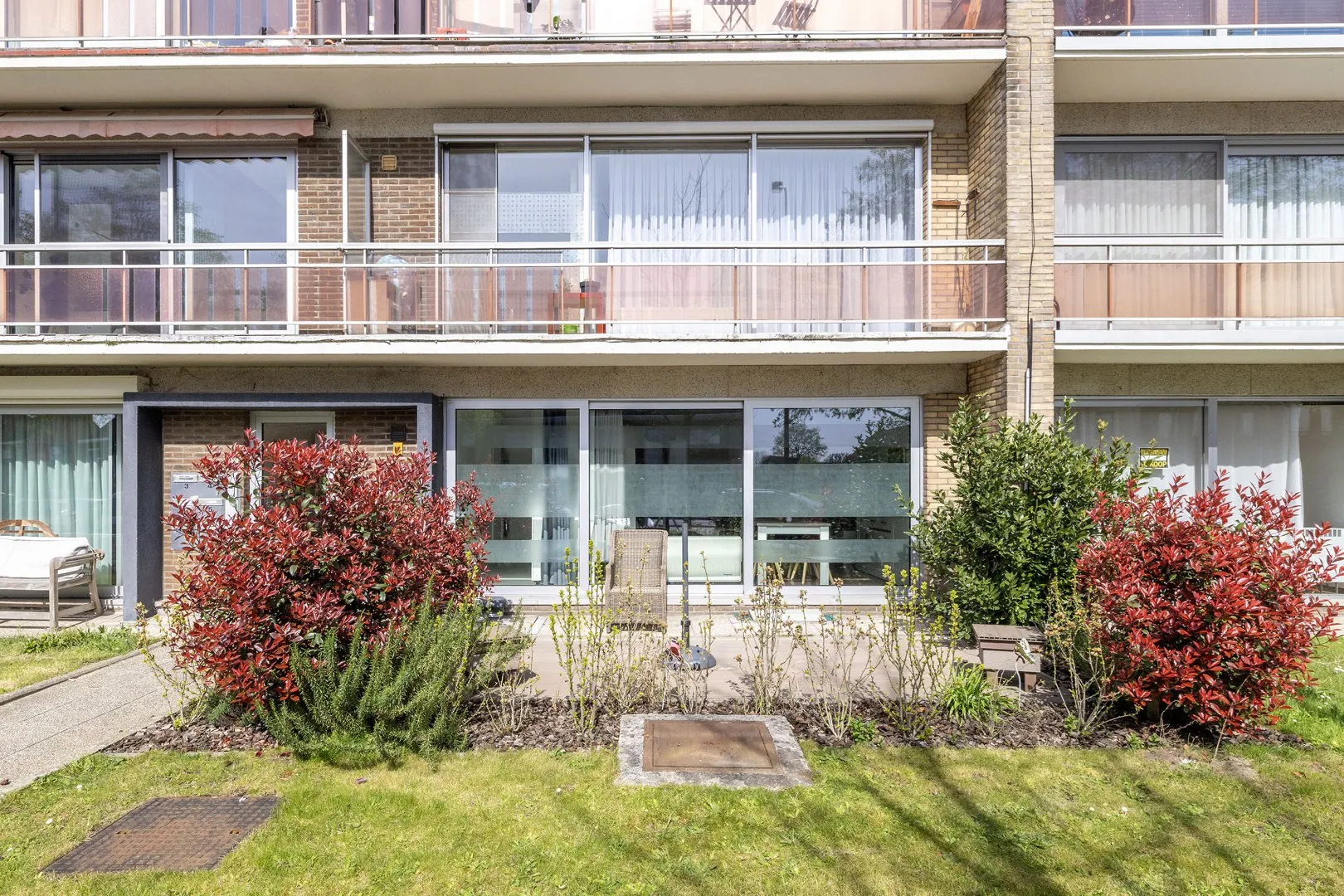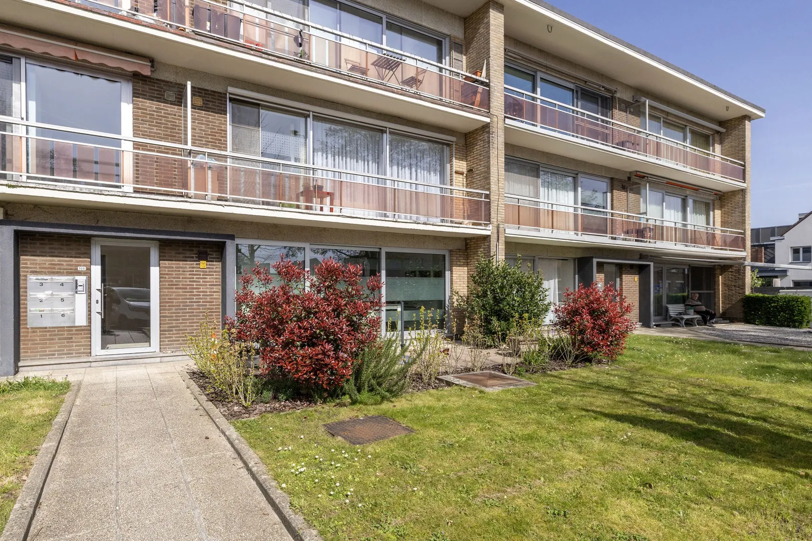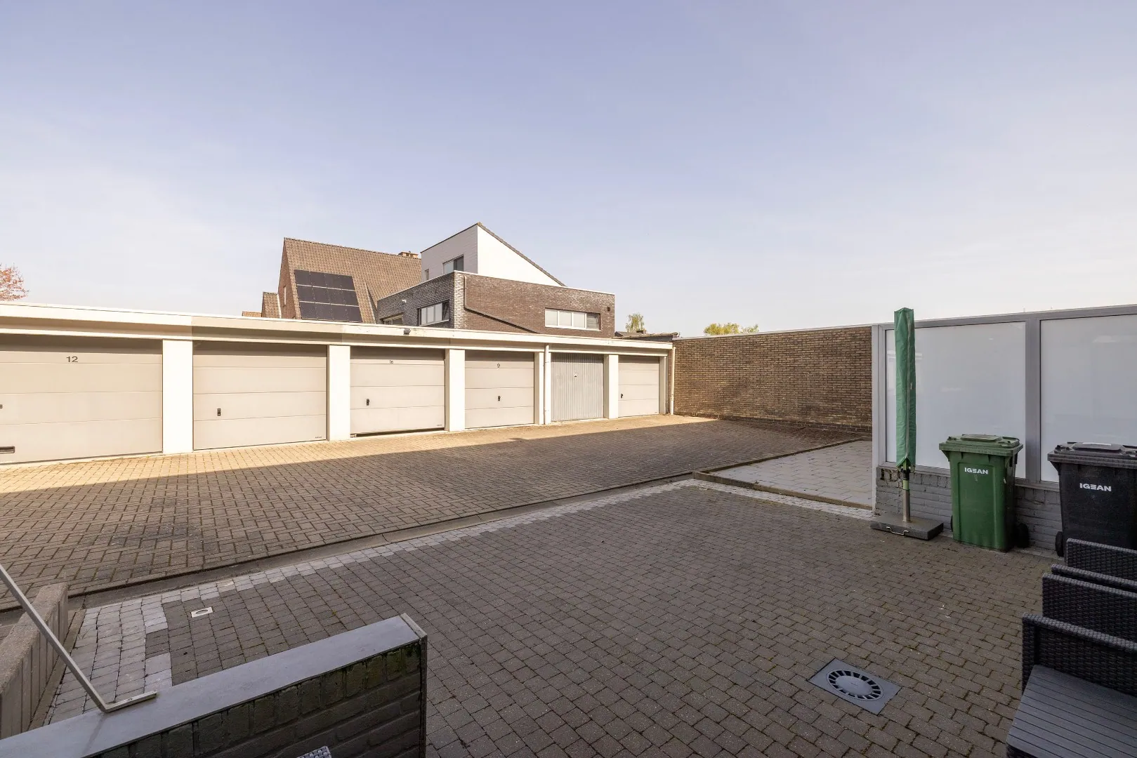 de badkamer met ligbad, dubbel lavabo, en badkamermeubel. Achteraan zijn er 2 volwaardige slaapkamers waarvan de kleinste met toegang tot het terras achteraan. De tuinzone vooraan, met ZO-oriëntatie, is privatief en heeft een gezellig terrasje op bankirai. Het terras achteraan werd aangelegd op klinkers en geeft directe toegang tot de bijbehorende garagebox (+ € 25000). Het appartement heeft eveneens een eigen kelderberging.