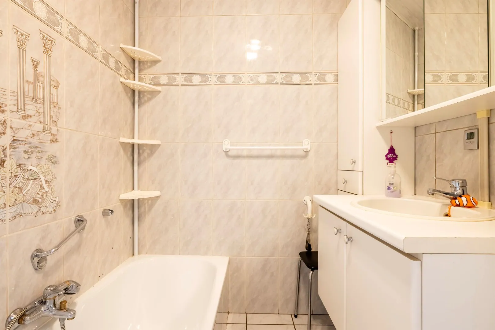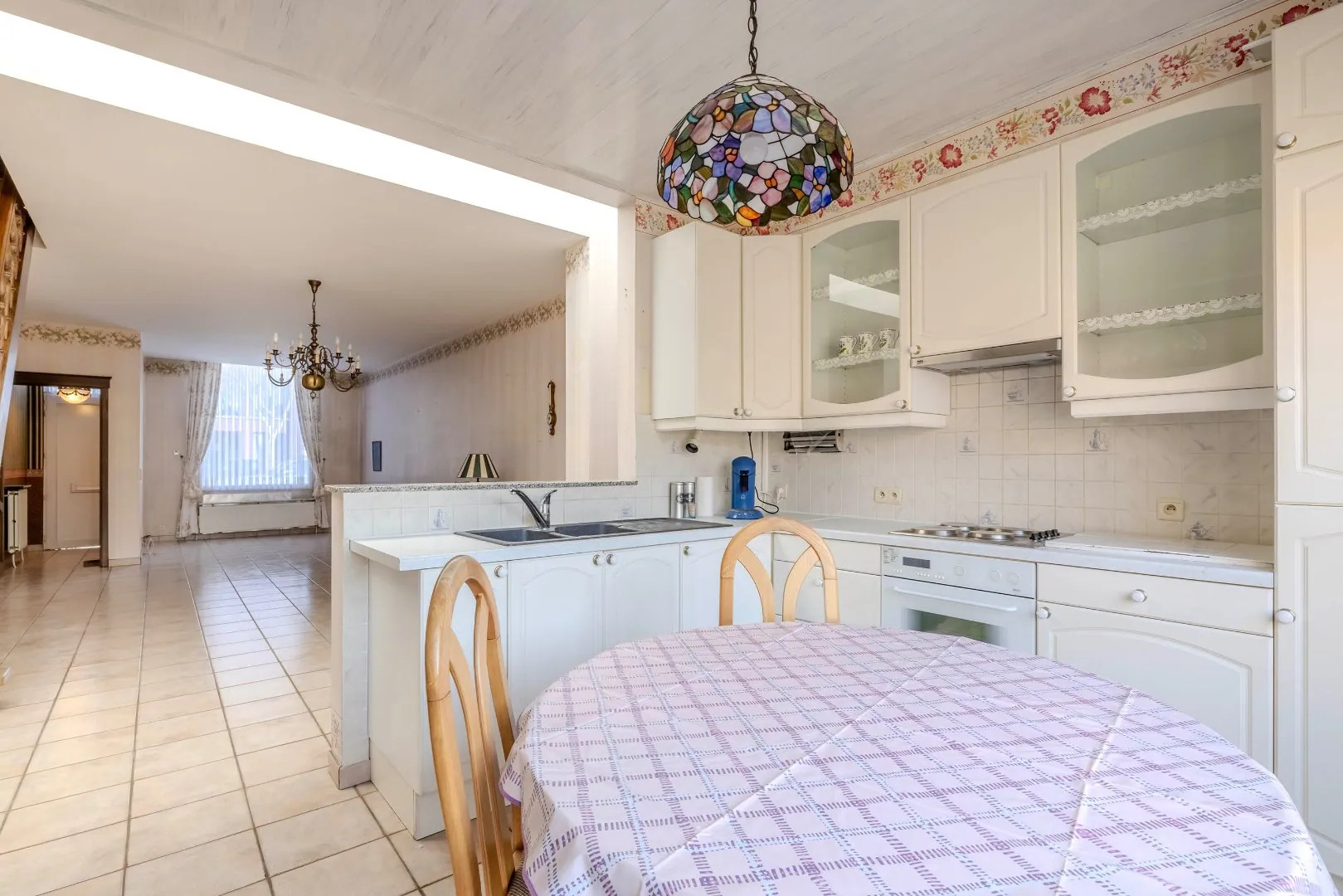 GLV: inkom, lichtrijke woonkamer met aansluitend de geïnstalleerde keuken met ontbijthoek, ruime gelijkvloers slaapkamer, badkamer met ligbad en lavabo, apart toilet, technische berging/wasplaats (WM/DK) en ruime garage.