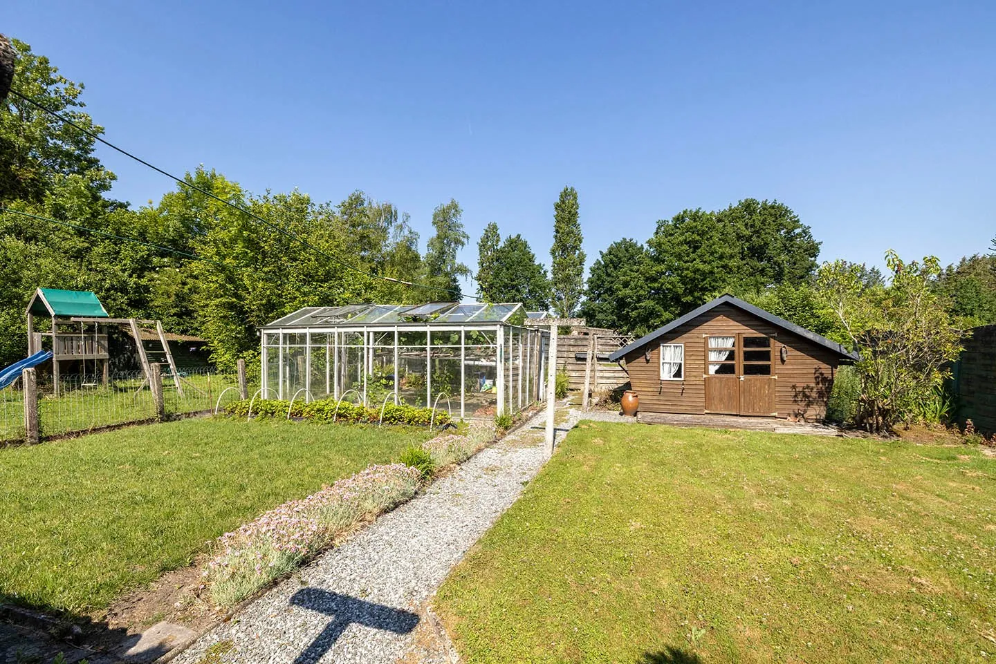 De tuinzones zijn onderhoudsvriendelijk aangelegd. De achtertuin op gazon is voorzien van een hobbyserre en een tuinberging. De garage biedt plaats voor één auto en de oprit biedt plaats voor nog enkele extra wagens.