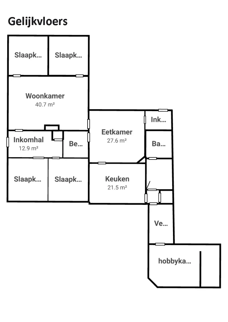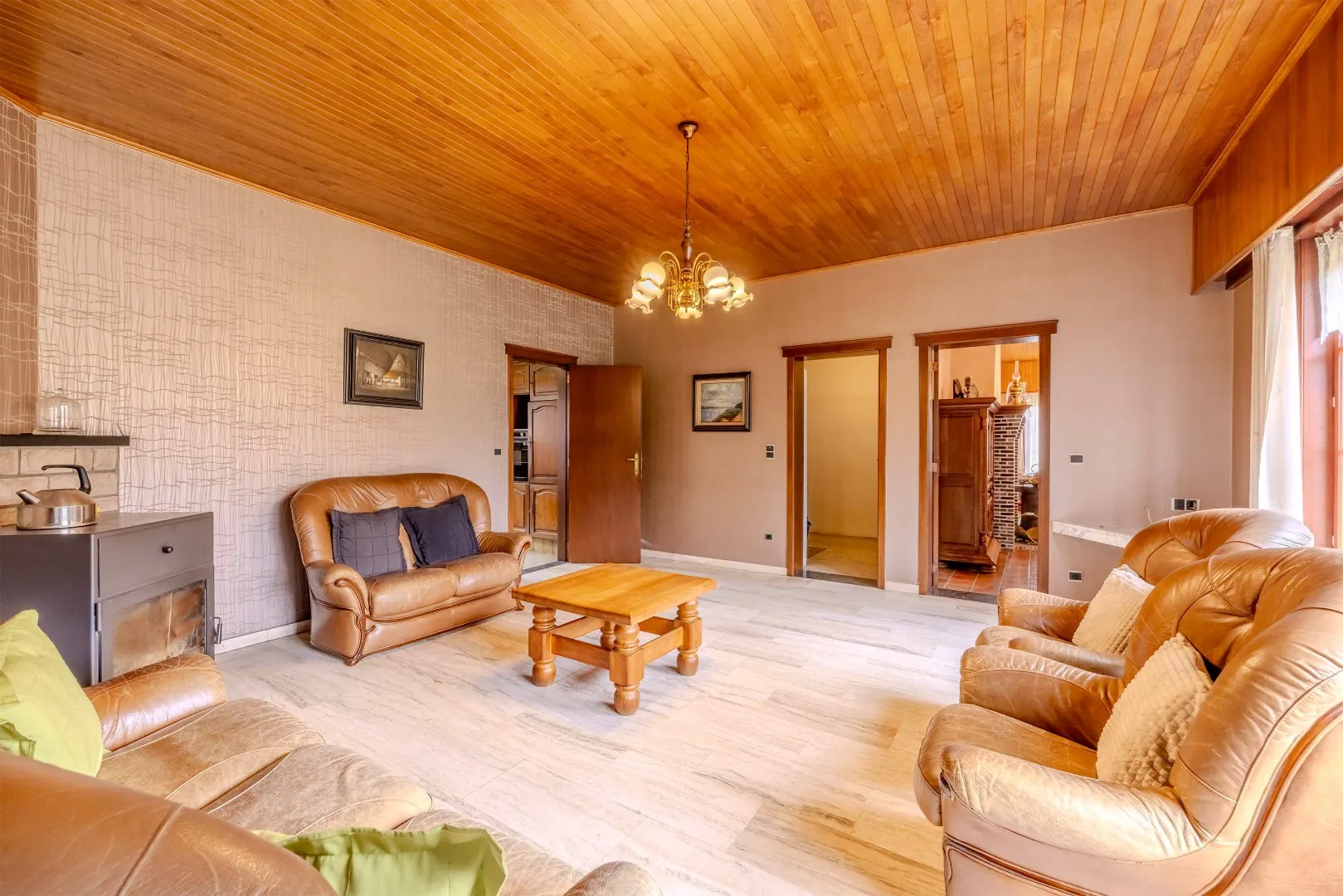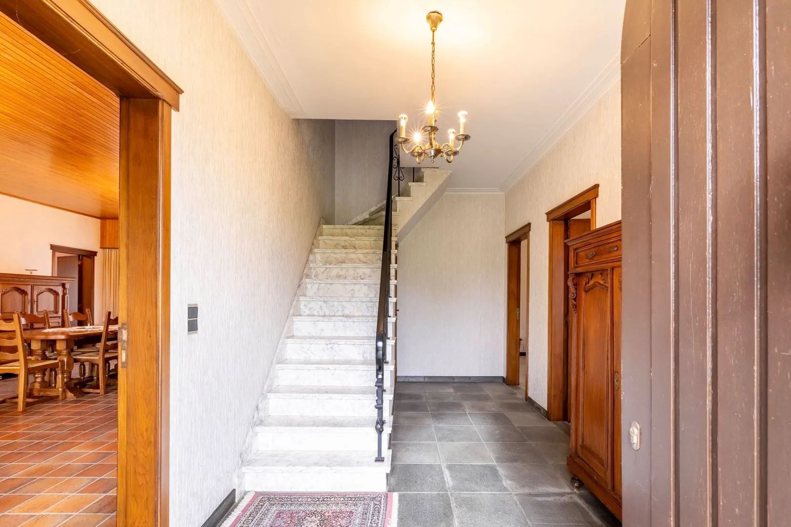 Inkomhal, riante woonkamer, koele berging, 4 volwaardige slaapkamers, zij-ingang, riante eetkamer met aanpalend de ruime keuken, tussenhal, technische berging, badkamer met douche, lavabo en toilet, veranda en hobbykamer..