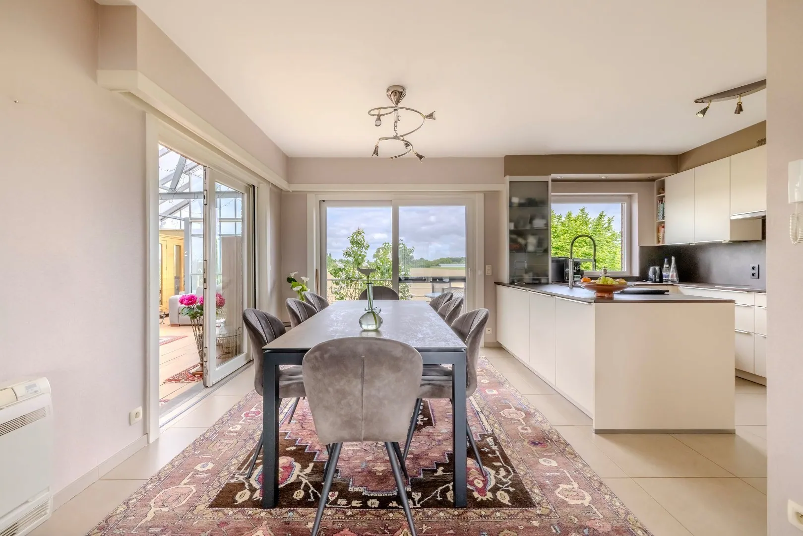 Bovenverdieping (in 2021 vernieuwd) – overloop, toilet, ruime en lichtrijke woonkamer met mooi panorama, hyper-geïnstalleerde open keuken, ruime eetplaats, veranda, ruime en comfortabele badkamer, wasplaats (WM/DK) en 4 ruime slaapkamers. Het terras biedt een ideaal zicht op de grote, groene zone achter de woning.